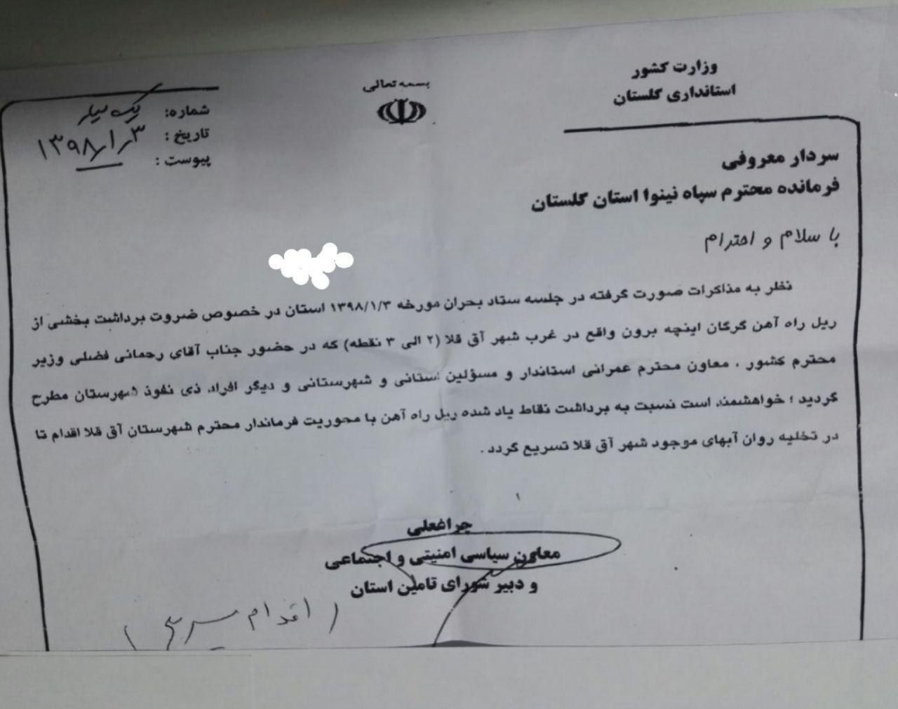 درخواست استانداری گلستان از فرمانده سپاه برای انفجار ریل قطار+تصویر