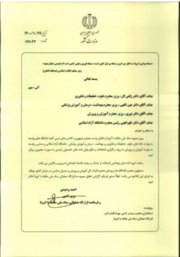 در ابتدای ابلاغیه احمد وحیدی خطاب به وزیران علوم، بهداشت، آموزش و پرورش و رییس دانشگاه آزاد اسلامی آمده است: پیرو مصوبه ستاد ملی مقابله با کرونا و ابلاغ رییس جمهور، کلاس های درس تمامی دانشگاه های وابسته به وزارت علوم، تحقیقات و فناوری و بهداشت، درمان و آموزش پزشکی، دانشگاه آزاد اسلامی و مدارس وابسته به وزارت آموزش و پرورش به ویژه برگزاری امتحانات و دفاع پایان نامه های تحصیلی باید به صورت حضوری برقرار شود.