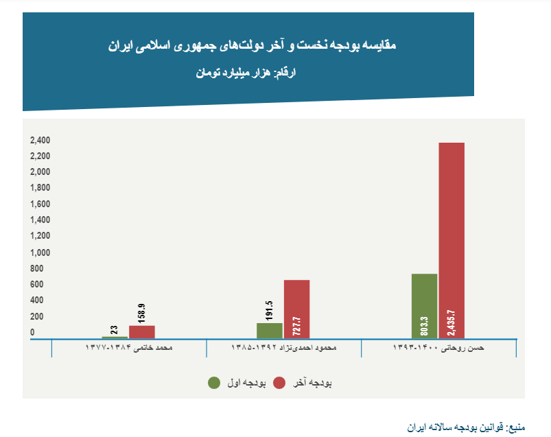 اما با روی کار آمدن دولت حسن روحانی سیر نزولی سرعت رشد بودجه ایران همزمان با تشدید تحریمهای اقتصادی آمریکا و افزایش دامنه شورشهای شهری کاهش یافت. در حالی که نخستین بودجه تنظیم و اجرا شده توسط دولت او در سال ۱۳۹۳، ۸۰۳.۳ هزار میلیارد تومان بود، این رقم بر پایه لایحه بودجه سال ۱۴۰۰ که روز چهارشنبه (۲ دسامبر/۱۲ آذر) و به عنوان آخرین بودجه تنظیمی دولت دوم روحانی به مجلس پیشنهاد شده، با ۲۰۳ درصد رشد به دو هزار و ۴۳۵.۷ هزار میلیارد تومان رسیده و نزدیک به ۳ برابر شده است.