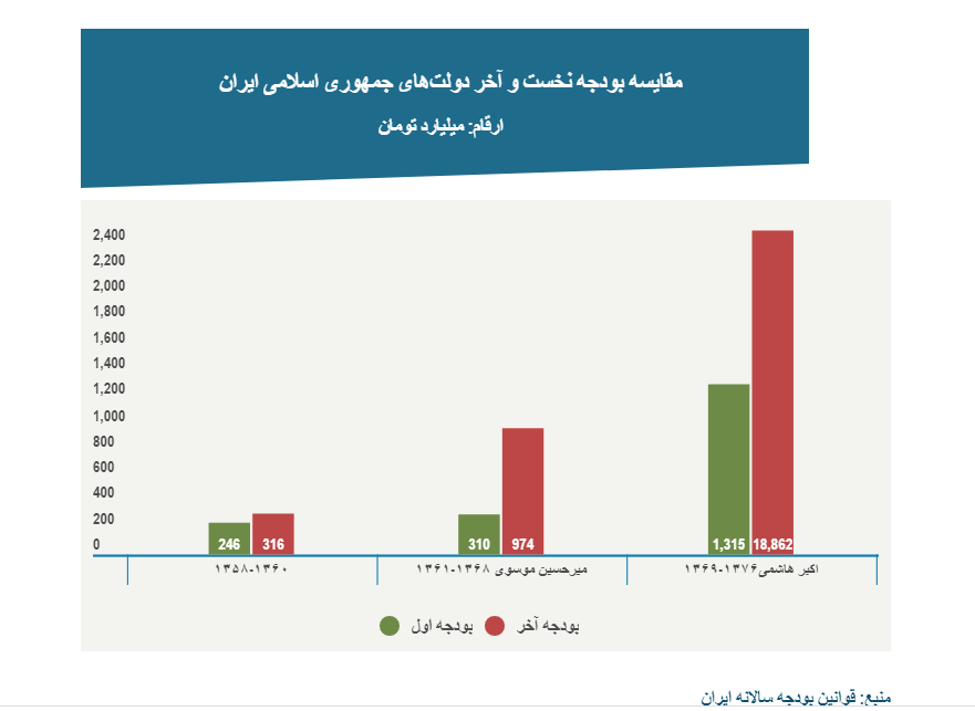 در دوران ۸ ساله نخست وزیری میرحسین موسوی و همزمان با جنگ ایران و عراق، بودجه کشور با حدود ۲۱۴ درصد رشد از ۳۱۰ به ۹۷۴ میلیارد تومان افزایش پیدا میکند اما این رشد پس از پایان جنگ و در دوران هشت ساله ریاست جمهوری اکبر هاشمی رفسنجانی به هزار و ۳۳۴ درصد میرسد و رقم کلی بودجه کشور ۱۴.۳ برابر میشود. در این دوره برای نخستین بار رقم برنامه مالی یکساله دولت از هزار میلیارد تومان فراتر میرود و تا در سال ۱۳۷۶ به ۱۸ هزار و ۸۶۲ میلیارد تومان بالغ میشود.