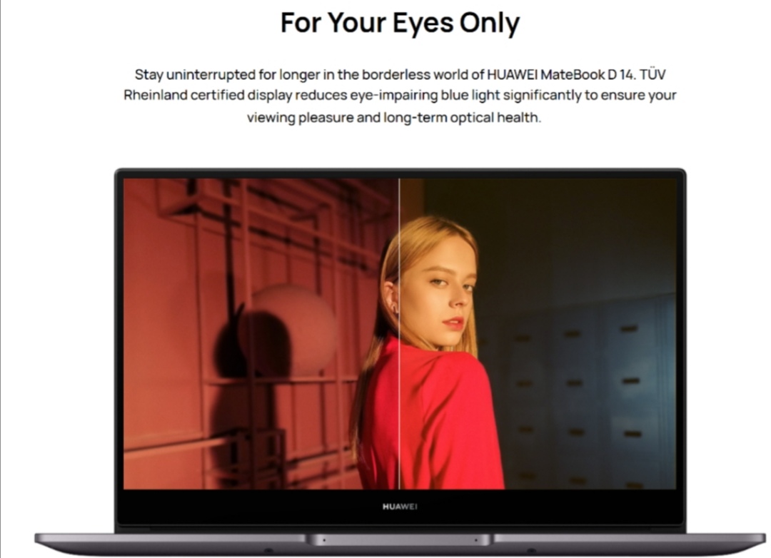 استفاده طولانی مدت از دستگاه‌های الکترونیکی می‌تواند آسیب‌های جدی به چشم کاربر وارد کند. سری Huawei MateBook D این مشکل را با به‌کارگیری صفحه‌نمایش IPS مجهز به فناوری ضد تابش خیره‌کننده (Anti-Glare) رفع کرده است. این راهکار سخت‌افزاری با روشی نرم‌افزاری ادغام شده تا شدت نور مضر آبی صفحه‌نمایش و تاثیرات نامناسب دمای رنگ به حداقل مقدار ممکن برسد. در این بخش گرفتن گواهی TÜV Rheinland اطمینان‌بخش عملکرد کامل و بدون ایراد است.