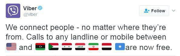 مدیران وایبر در اعتراض به دستور جدید ترامپ مبنی بر منع ورود مسلمانان 7 کشور ازجمله ایران، هرگونه تماس بین آمریکا و این کشورها را رایگان کرد.