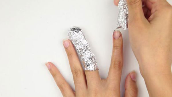 ۳. بعد از آن با فویل آلومینیومی دور ناخنها و سر انگشتانتان را به مدت ۱۵ دقیقه کاملا بپوشانید. بعد از قرارگیری ورقههای آلومینیومی روی ناخن ها، کمی استون یا لاک پاک کن روی پنبه ریخته و آن را دورن فویل قرار دهید.