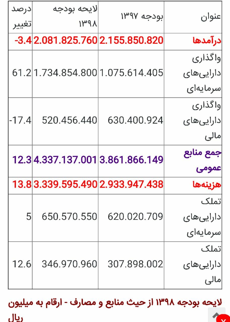 جزئیات ارقام کلان بودجه که برای اولین بار منتشر شد نشان میدهد سقف کل بودجه سال ۱۳۹۸ کشور با ۴۱.۵ درصد رشد به ( ۱۷ هزار و ۳۰۰ ) هزارمیلیارد ریال رسیده است.بیشترین نقش در کل بودجه، منابع شرکتهای دولتی، بانکها و موسسات بازی می کنند.